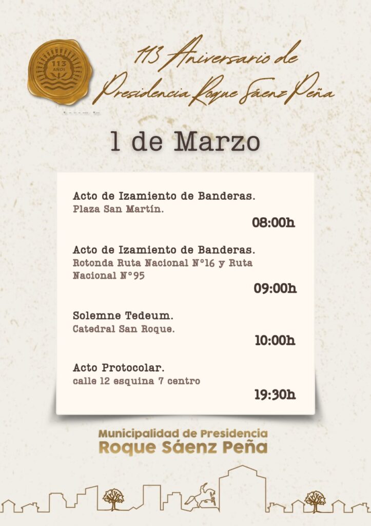 En tanto que el sábado 1 de marzo, día del aniversario, tendrán lugar las actividades protocolares a partir de las 8 horas con el izamiento de Banderas en la plaza San Martín, continuará a las 9 con el izamiento de la Bandera de la ciudad en el mástil de la rotonda de rutas 16 y 95; a las 10 se realizará el Tedeum y a las 19:30 culminará la jornada con el acto central y desfile.