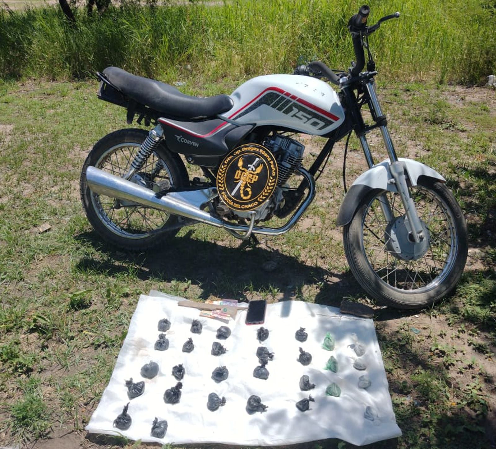 Allí observaron que se acercaban a gran velocidad dos personas a bordo de una motocicleta color blanca, a quienes realizaban las señales de detención respectivas y estos sujetos, al verse sorprendidos por el inesperado control, frenaron repentinamente y derraparon, girando en sentido contrario intentando escapar, mientras se ve que arrojan una bolsa. Metros más adelante los agentes lograron interceptarlos, tratándose de un hombre de 26 años y su acompañante de 21 ambos oriundos de Machagai, que llevaban dentro de la bolsa secuestrada un total de 29 envoltorios tipo “bochitas” de marihuana que arrojó un peso de 625 gramos, procediendo al secuestro de la sustancia así como también, de un celular y la motocicleta marca Corven 150cc. en la que se movilizaban.