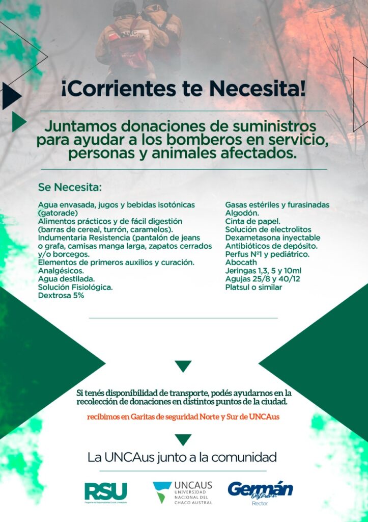 La Universidad Nacional del Chaco Austral, su Rector German Oestmann y el RSU, Programa de Responsabilidad Social Universitario comenzó una campaña para juntar donaciones para ayudar a los Bomberos, personas y animales afectados por los incendios forestales en la vecina provincia de Corrientes.
