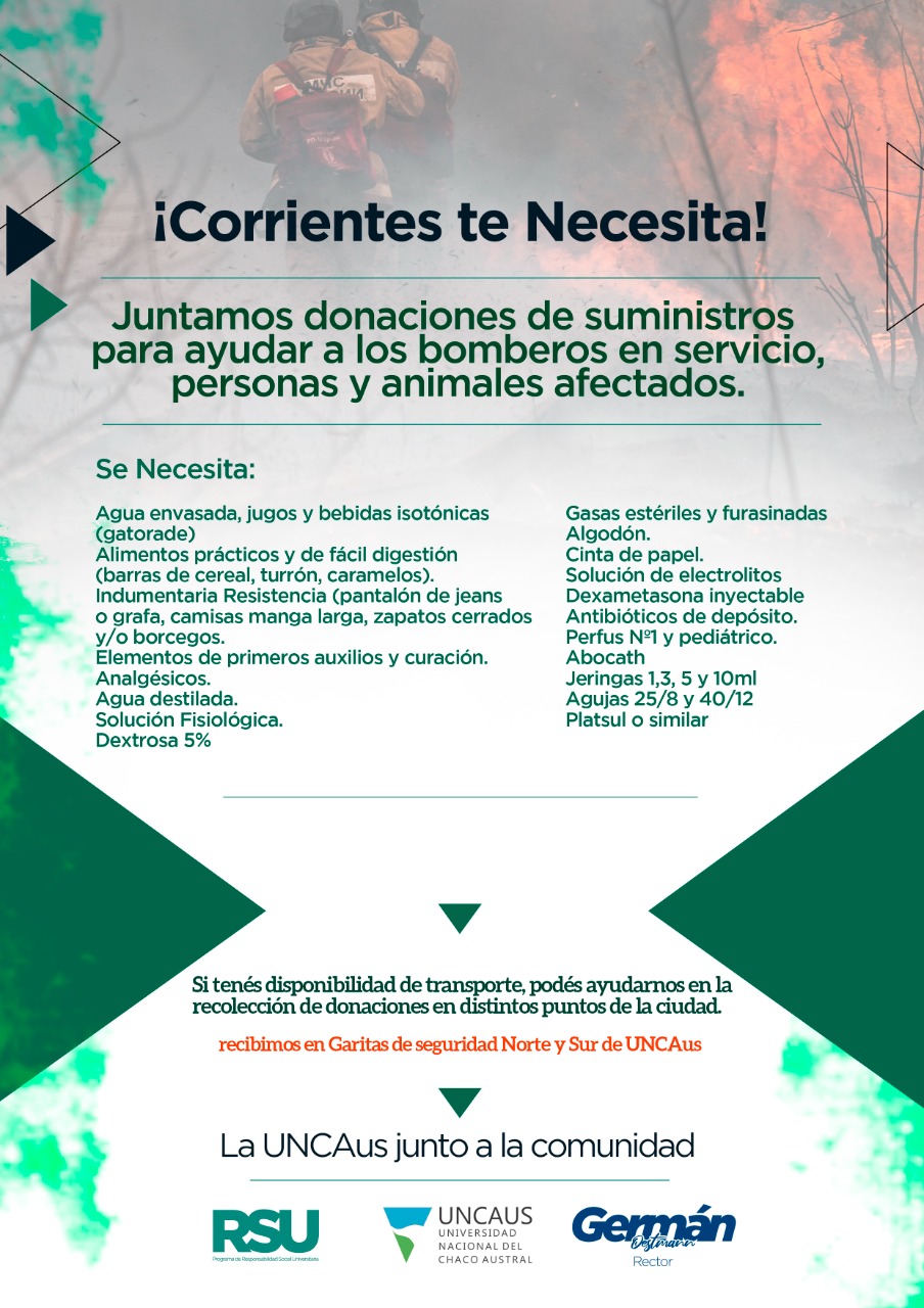 La Universidad Nacional del Chaco Austral, su Rector German Oestmann y el RSU, Programa de Responsabilidad Social Universitario comenzó una campaña para juntar donaciones para ayudar a los Bomberos, personas y animales afectados por los incendios forestales en la vecina provincia de Corrientes.