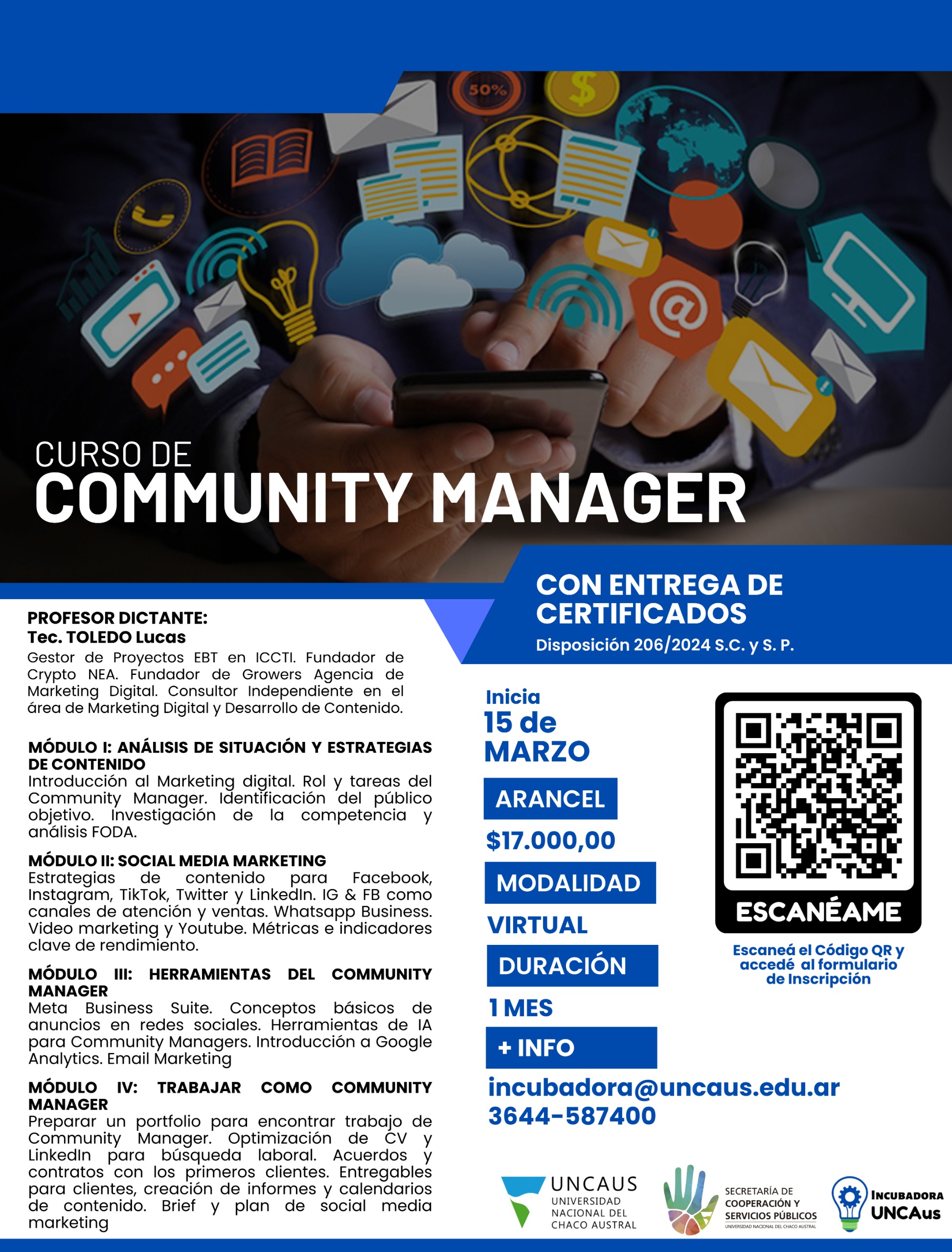 El curso está destinado a emprendedores, profesionales y público en general, interesado en adquirir conocimientos sobre el tema.La propuesta está aprobada por Disposición Nº 206/2024- S.C. y S.P. de la Universidad y contiene cuatro módulos de trabajo. Los mismos serán dictados por el gestor de Proyectos EBT en ICCTI; fundador de Crypto NEA; fundador de Growers Agencia de Marketing Digital; consultor independiente en el área de Marketing Digital y Desarrollo de Contenido, Lucas Toledo.MódulosAnálisis de situación y estrategia de contenido; social media marketing; herramientas del community manager; trabajar como community manager.